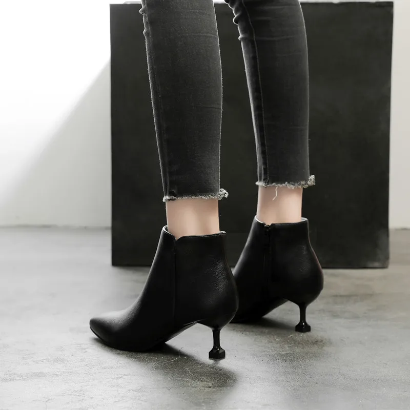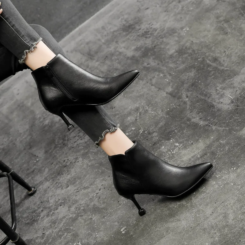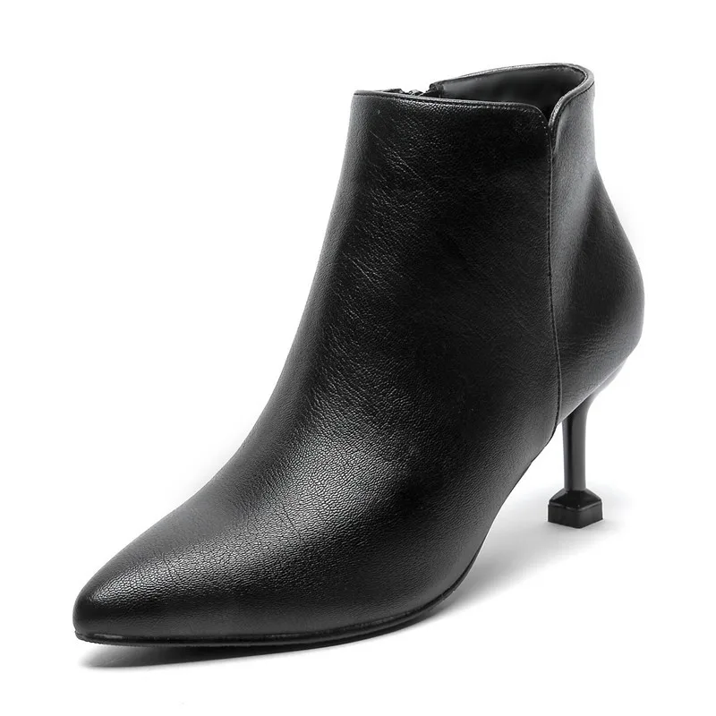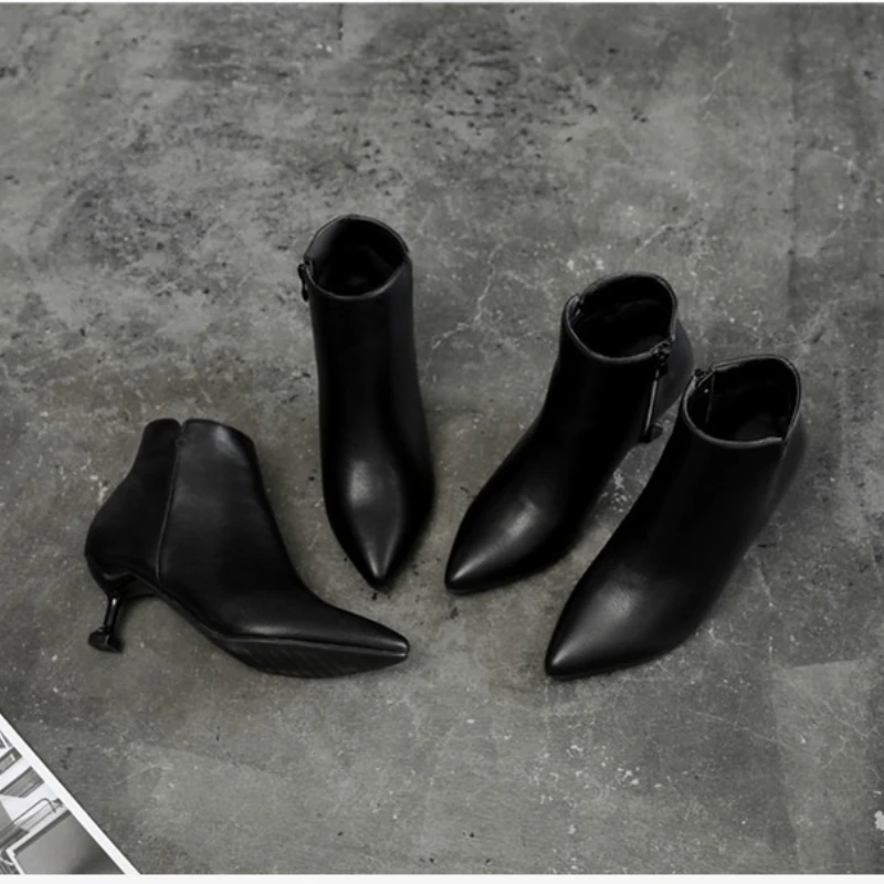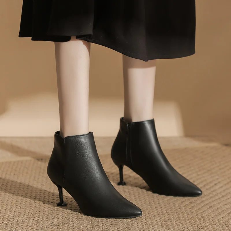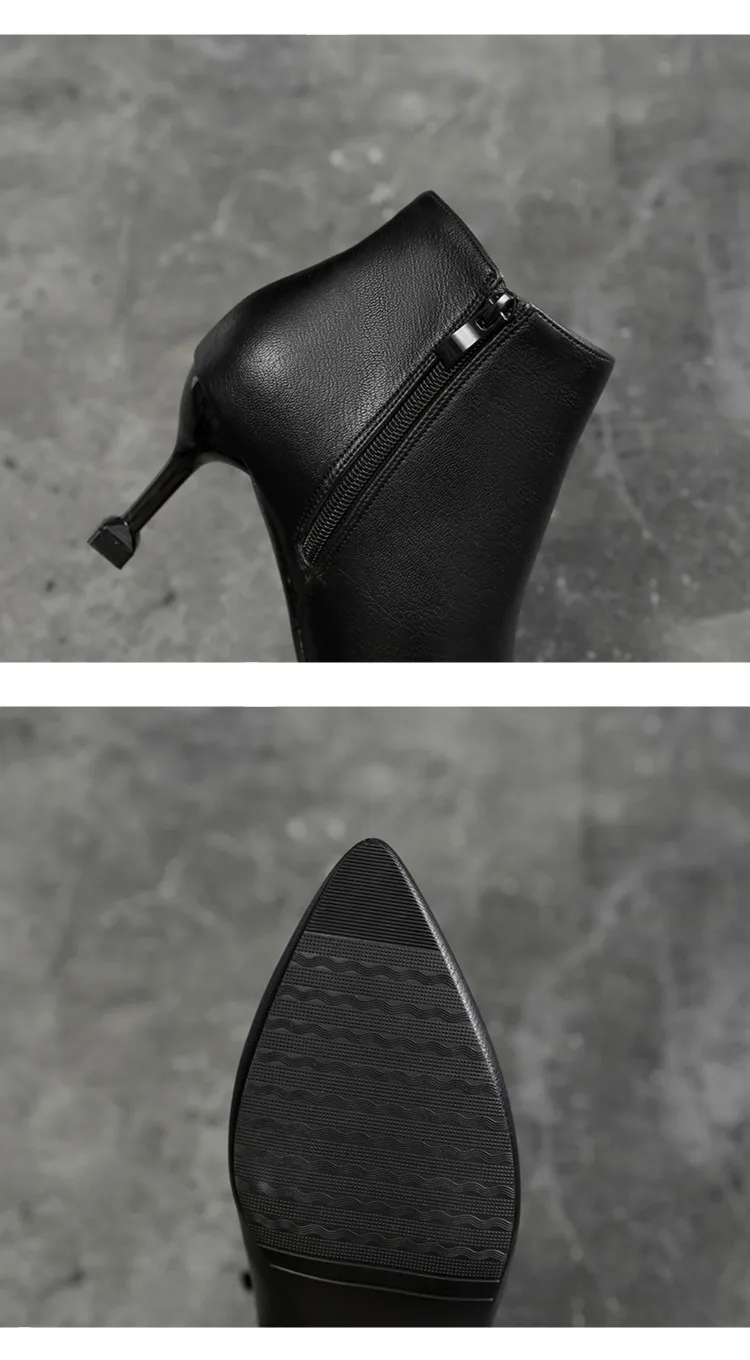 Luxurious black leather + sharp pointed toe elevate winter outfits (dresses, skirts, jeans) with refined elegance.