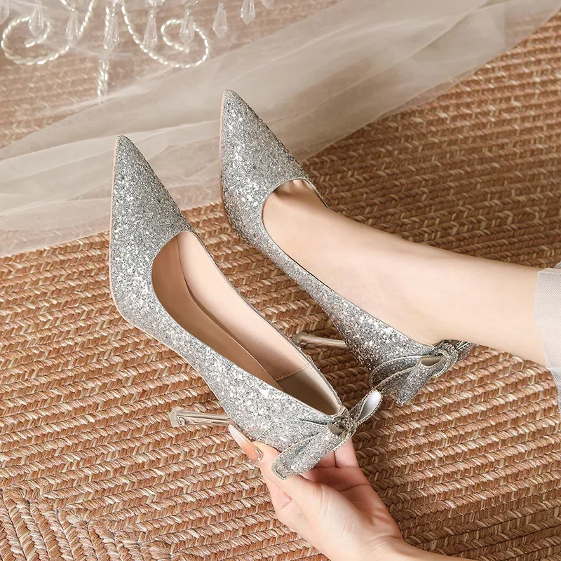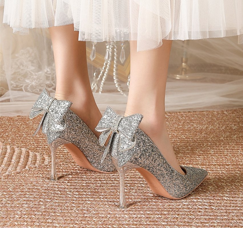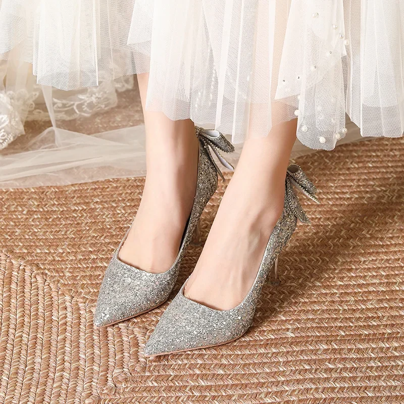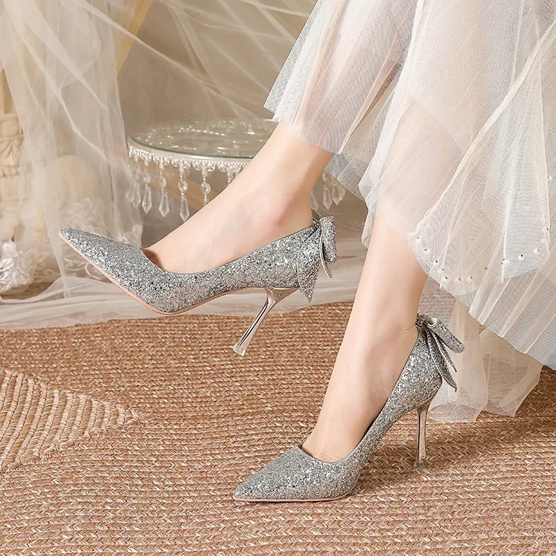 WP-0037 Size 30-44 Wedding Shoes Bride Bridesmaid High Heels Silver Sequins Glitt Thin Heel Bow Stiletto Heel Point Toe Pumps Women